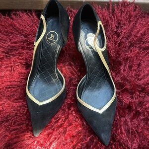 Elevate your style with these Balmain heels, featuring a sleek black leather design accented by subtle gold hardware. The pointed toe and stiletto heel create a timeless silhouette, perfect for adding a touch of sophistication to any ensemble.