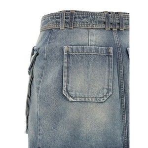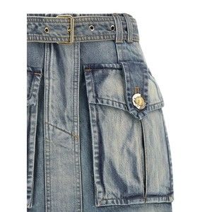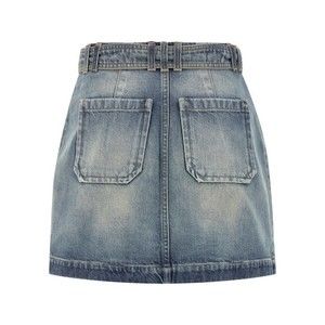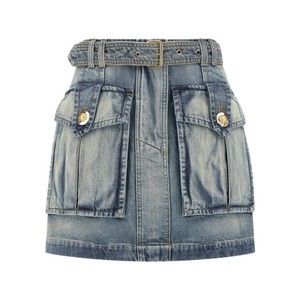 This mini skirt, made in Italy, showcases a contemporary utility design. Large cargo pockets are adorned with distinctive metal Gold and Gold Coin buttons. A front zip and snap button closure, along with back patch pockets, enhance practicality. An adjustable and removable belt allows for a customizable fit. The faded, vintage-inspired wash with contrast stitching adds a standout aesthetic.