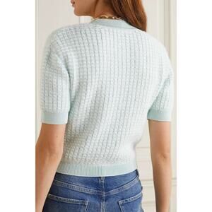 Featuring a round neckline, short sleeves, a cropped silhouette, and a straight hem. Knitted construction with a two-tone motif print. Decorative button detailing with gold-tone hardware. Material: organic cotton blend with glitter finish. Fits true to size