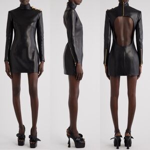Balmain Cutout Long Sleeve Lambskin Leather Minidress with Gold Snail Buttons