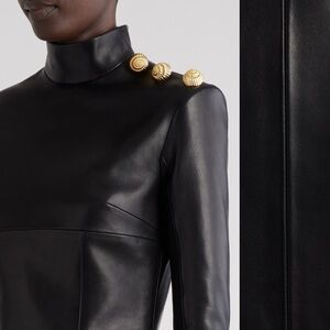 Crafted from supple lambskin leather, this Balmain minidress embodies bold sophistication with a sculpted silhouette, high stand collar, and long sleeves finished with zip cuffs. The design is elevated with ornate goldtone snail buttons at the shoulder, a signature Olivier Rousteing detail inspired by his Bordeaux heritage. An alluring back cutout adds modern sensuality, making this piece unforgettable from every angle. Professionally leather-cleaned and made in Turkey, this statement dress captures Balmain’s signature blend of Parisian edge and timeless luxury.