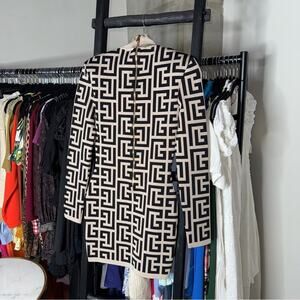 An unmistakable Balmain masterpiece, this monogram mini dress is the ultimate statement of Parisian power dressing. Crafted in France from a luxe heavyweight knit, it features sharp padded shoulders, a sleek mock neckline, and the house’s bold ivory-and-noir monogram motif. The body-hugging silhouette and exposed back zip bring undeniable edge, making it the perfect dress for the woman who wants to command every room — and every photo. Equal parts timeless and on-trend, this dress embodies high-fashion allure with influencer-ready glamour.