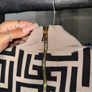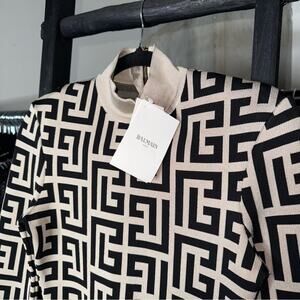 An unmistakable Balmain masterpiece, this monogram mini dress is the ultimate statement of Parisian power dressing. Crafted in France from a luxe heavyweight knit, it features sharp padded shoulders, a sleek mock neckline, and the house’s bold ivory-and-noir monogram motif. The body-hugging silhouette and exposed back zip bring undeniable edge, making it the perfect dress for the woman who wants to command every room — and every photo. Equal parts timeless and on-trend, this dress embodies high-fashion allure with influencer-ready glamour.