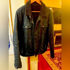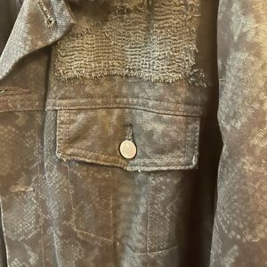 This is a jacket coat which feels as good as it looks is Amazing . Subtle Snakeskin print imbedded in the black denim like cotton , heavy zippers at pockets and fur on inside . A great find for anyone who enjoys quality and style