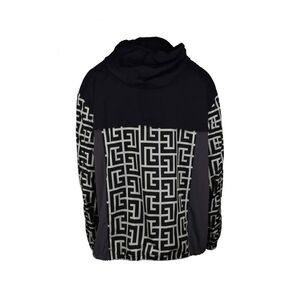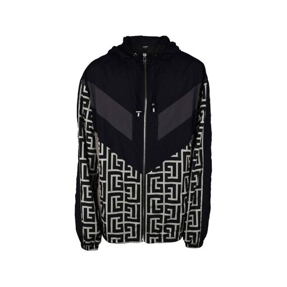 Balmain black and beige nylon windbreaker jacket.<br />Black drawstring hood.<br />White and black monogrammed logo on bottom and sleeves.<br />Beige and brown details.<br />Zip closure.<br />Side zip pockets.<br />Elasticated waist and sleeves.<br />Long sleeves.