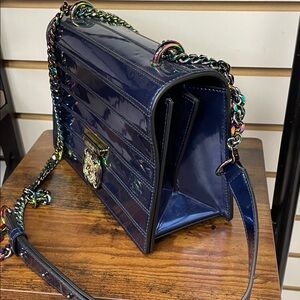 Elegant metallic blue bag with striking chain detail. Ideal for stylish events.