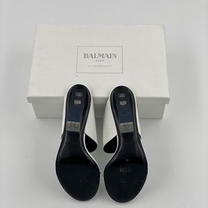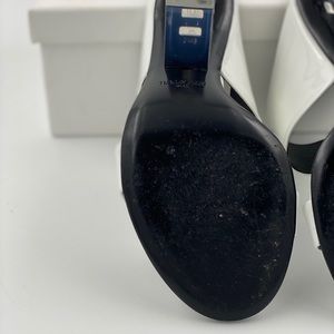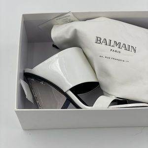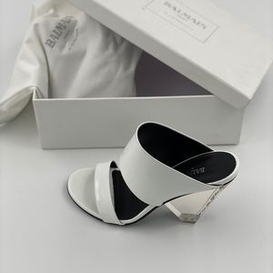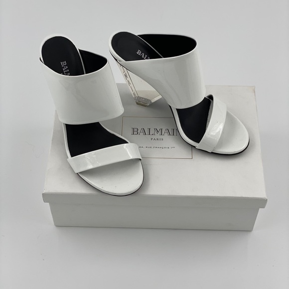 Box and Dust Cover included. White patent leather mules with clear engraved heels.