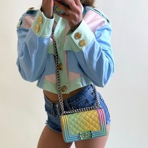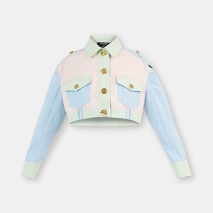 Balmain Multicolor Pastel Crop Blue Pink Seafoam Green Button Jacket Denim