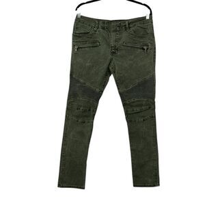 Balmain Men’s Olive Green Biker Pants,zipper closure/Hook closure.Preloved reflects minor wear.Stock photo for reference only.Approx measurement Waist 32", Length 37.5", Inseam 29", Rise 9". Leg Opening 6.5".