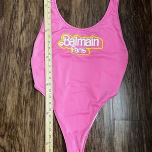 Balmain Paris x Barbie limited edition collection one piece swimsuit, size 46. Pink/white/yellow x Barbie logo-print swimsuit from Balmain featuring logo print to the front. Round neck and low back, New without tags.