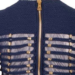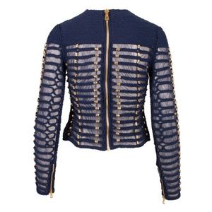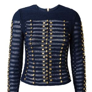 This top is a must-have for any fashion-forward woman who wants to make a statement. The blue hue is both bold and versatile, while the gold metallic accents add a touch of glamour and sophistication. The Balmain and H&M collaboration is highly sought after, and this top is no exception - it's sold out everywhere and is incredibly hard to find.