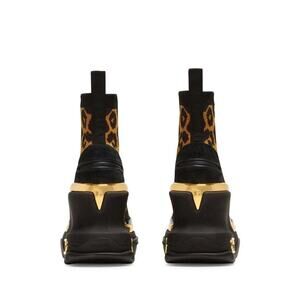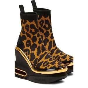 Get your daily steps in with these adorable sneakers. Step into chic style with the Women's Leopard B-bold Wedge High-top Sneakers by Balmain, featuring a striking leopard-print knit fabric design. These sneakers boast a wedge heel with metallic insets and an almond toe, complemented by an elastic collar with a convenient pull-tab for a sleek, pull-on style. Meticulously crafted in Italy, they ensure quality with a 100% rubber outsole and 100% fabric lining. Heel height measures an impressive 4 inches, offering an elevated yet comfortable wear.