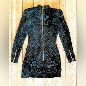 Iconic Balmain x H&M collaboration dress – size 4. This stunning piece is crafted from a silk blend with luxe velvet burnout detailing in an intricate baroque-meets-geometric pattern. Features long sleeves with gold-tone zip cuffs, high neckline, and body-skimming silhouette. A rare runway-inspired design from the sold-out 2015 collection.