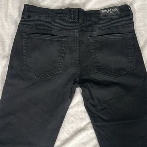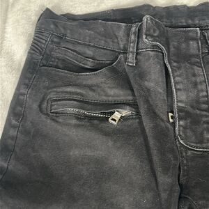 Sleek black straight leg jeans with zipper details. Modern and edgy design. Ideal for a bold look.
