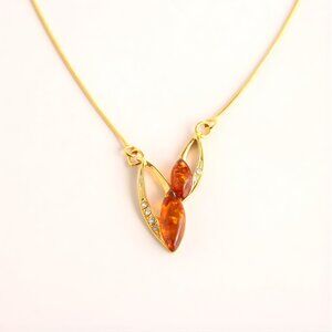 This amber necklace highlights the warm glow of cognac Baltic amber with a refined, graceful design. Two marquise-cut amber cabochons form the centerpiece, set along flowing 14k gold-plated sterling silver curves accented with clear cubic zirconia stones. The smooth lines and radiant tones give this amber necklace a polished, luminous presence that feels both elegant and expressive.