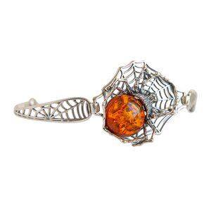 The spider bracelet's centerpiece is a stunning cognac amber stone, that brings a warm, rich hue to the design, perfectly complementing the silvery web and spider. With dimensions of 32.6mm by 32.2mm, this eye-catching accessory commands attention, making it perfect for those who want to stand out.