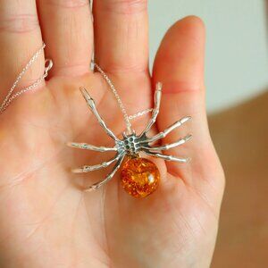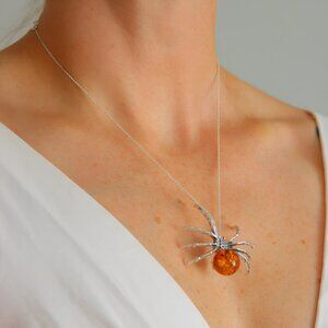 This Baltic cognac amber large spider necklace is a bold amber necklace that showcases the natural beauty of Baltic amber and detailed silver work. Crafted in 925 sterling silver, it features a lifelike spider design with a round cognac amber gemstone forming its body. The contrast of warm amber tones and polished silver gives this piece a distinctive presence and modern appeal.