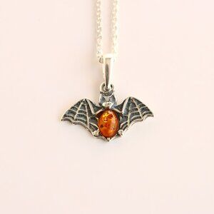 Baltic Amber Tiny Bat Necklace in 925 Sterling Silver