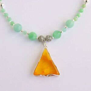 Stunning Lemon Amber Triangle Pendant with Burma Jadeite Beads – Handmade Statement Necklace by Alexis Cintron