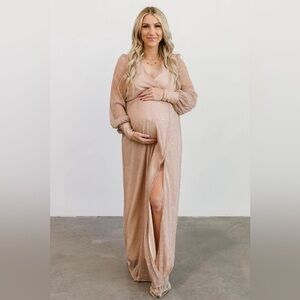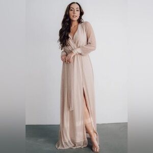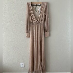 Elegant maxi dress with long sleeves. Features a wrap design and subtle shimmer. Perfect for special occasions.