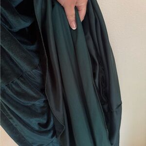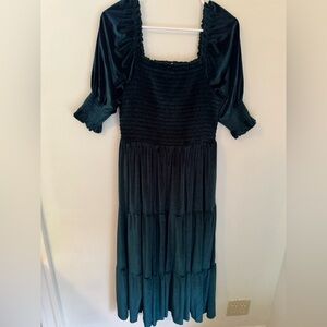 Elegant velvet midi dress with smocked bodice. Features tiered skirt and puff sleeves. Ideal for special occasions. Very flattering, fully lined.