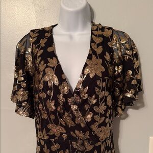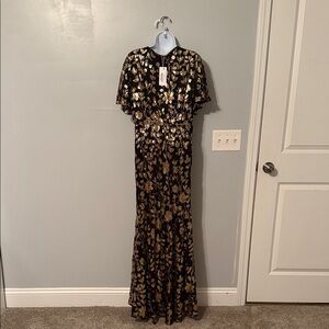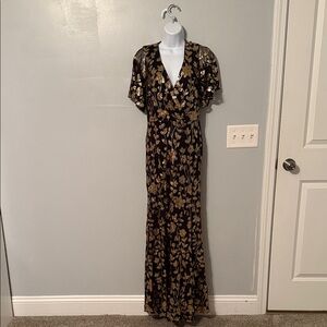 Elegant black maxi dress with gold floral pattern. Features a deep V-neck and short sleeves. Perfect for formal occasions.