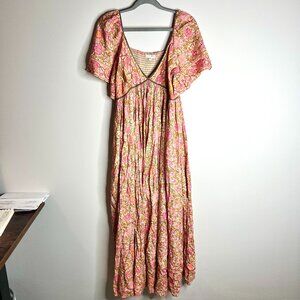 Baltic Born Evanthia Floral Pink Brown Boho Deep V Maxi Dress Flowy Bohemian XL
