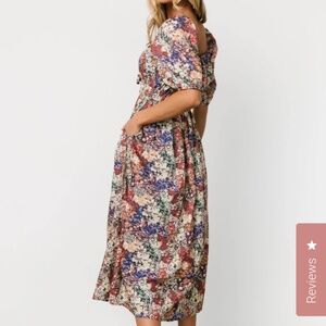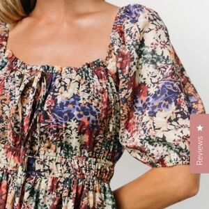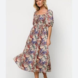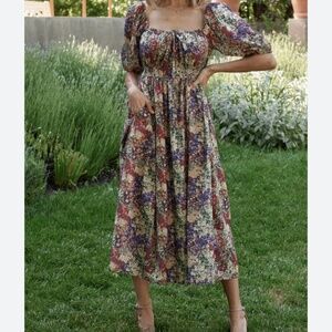 Elegant floral midi dress. Puff sleeves. Perfect for any occasion.