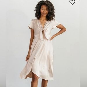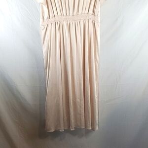 Baltic Born Poppy Satin Midi Dress in Champagne cream. Front tie bust. Short sleeves with subtle flutter. Smocked at back waist. Great condition, very faint spots at waistband as shown in last picture. Size XXXL.