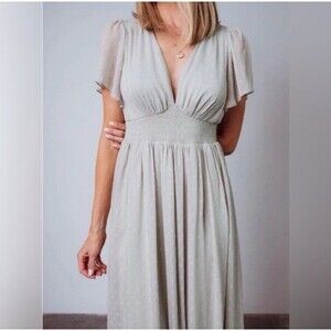 ️Style: Maxi length, V-neckline, short flutter sleeves, gathered at bottom of bust, smocked waistband, keyhole button on back, fully lined except at the sleeves, flows effortlessly