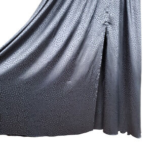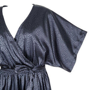 Baltic Born Savannah Print Kimono Faux Wrap Maxi Dress V Neck Short Sleeve Navy size medium. Satin, surplice v neck, kimono sleeves, elastic waistband with separate self tie sash, pockets, slit, partial lining, relaxed fit. Polyester. Machine washable.