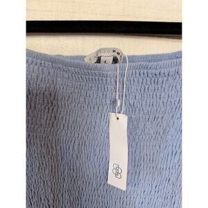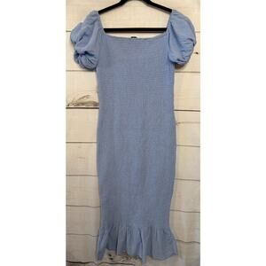 The Baltic Born Size LG NWT Dress in Light Blue is a preppy and cute option perfect for weddings, parties, or cocktails. This midi-length dress features puff sleeves, a pullover closure, and a fit and flare style. The dress is made of polyester and includes smocked details, adding a unique touch to the design. Ideal for summer, fall, or spring, this dress is a stylish choice for women looking for a flattering and trendy outfit.