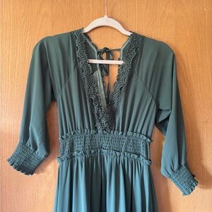 Chic teal maxi dress with ruffle details. Features lace accents and long sleeves. Ideal for stylish occasions.