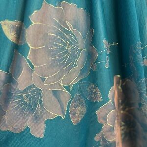 Chic dress with a navy base. Adorned with brown and gold floral designs. Sheer sleeves. Perfect for any occasion. Brand new- with tags attached