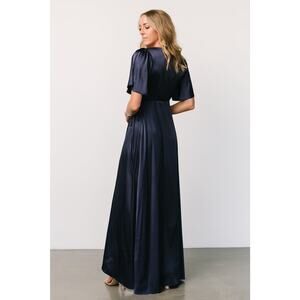Elegant and flowy, the Baltic Born Vara Maxi Dress is crafted in lustrous satin fabric with a flattering wrap silhouette. The navy blue hue, short flutter sleeves, and floor-length design make it perfect for weddings, evening events, or special occasions.