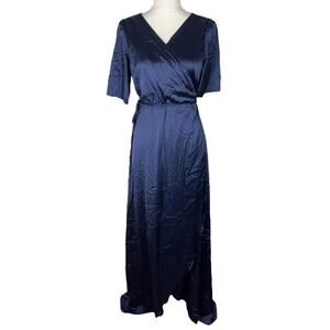 Baltic Born Vara Satin Maxi Wrap Dress Navy Blue Short Flutter Sleeves Size XL