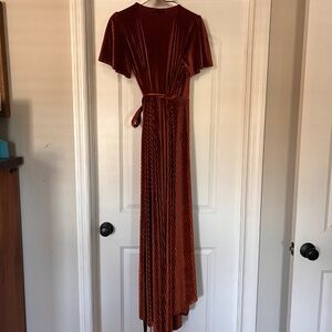 NWT: Gorgeous wrap maxi dress in striped rust velvet, inspired by the Baltic Born Meghan Rust Velvet Wrap Maxi. Features a flattering surplice neckline, self-tie wrap waist, flutter short sleeves, and an elegant asymmetrical hem. The subtle vertical stripes add dimension and elongation.