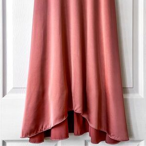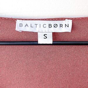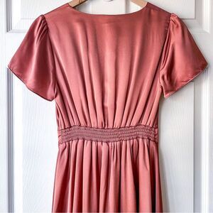 This listing is for a stunning dress from Baltic Born. Made of a smooth satin fabric that catches the light beautifully, this rose colored dress has flutter sleeves, a V-neckline, front tie, an elastic waist, and a flowing skirt that skims your body perfectly. It has been gently used and shows minimal signs of wear. This dress is a size small and the measurements (laying flat) are: