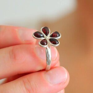 This Baltic cherry amber sunflower ring is crafted in genuine 925 sterling silver. The design features four polished amber cabochons arranged in a floral shape, creating a natural and vibrant look. With an adjustable band, this flower ring offers comfort and flexibility for everyday wear.