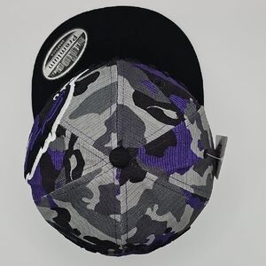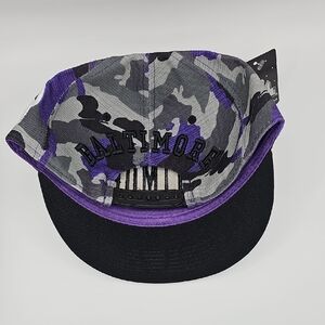 Stylish camo snapback hat with bold Baltimore lettering. Features purple and black accents.