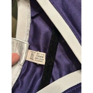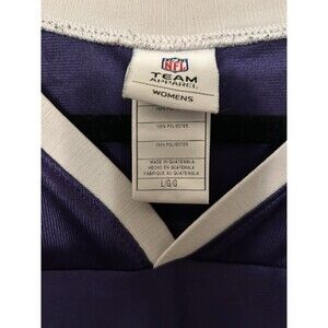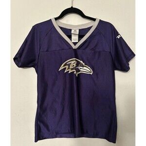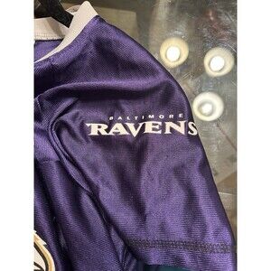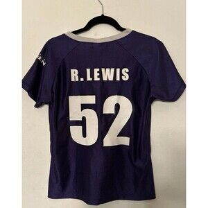 This product is a Reebok Baltimore Ravens Women's NFL Jersey featuring player number #52, Ray Lewis. The jersey is officially licensed by the National Football League and comes in a size large with a purple color. Designed specifically for women, this jersey is perfect for showing support for the Baltimore Ravens during the regular season. Perfect for fans of football and believers in the legendary Ray Lewis. pit to pit 20.5 A few snag spots as shown in the picture with the scissor but not pulling fabric. Almost like pills.