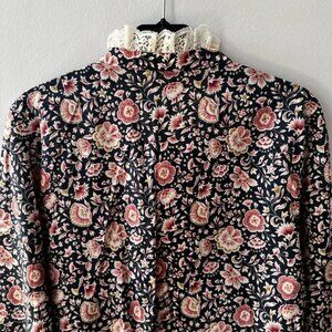 Chic floral blouse by Balzac Paris. Features delicate lace trim. Perfect for stylish outings. Never worn just the tag removed.