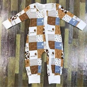 This Carhartt kids one piece features a charming patchwork design in brown and blue. Perfect for comfort and style.