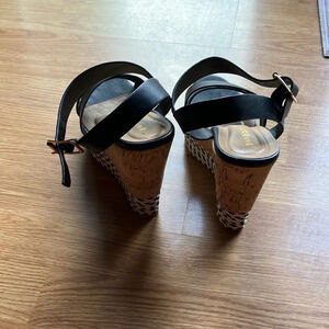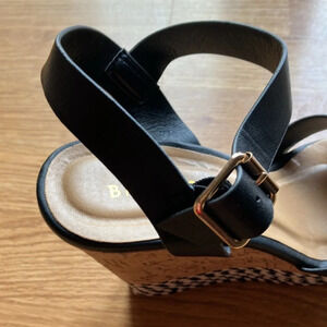 Bamboo Choice Women’s Fabric Lace Wedge Platform Sandals, Black 41, 9 1/2 according to chart. Adjustable Ankle Buckle, Approximately 5” heel, approximately 2” Platform, Open Toe, Synthetic materials. These cute wedges will complete your summer ensemble. Preowned in great condition.