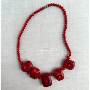 This necklace features chunky bamboo coral focal beads paired with smooth red glass accent beads for a bold, vibrant look. The focal beads show the natural variations and organic texture characteristic of bamboo coral, with rich red color that adds warmth and presence.