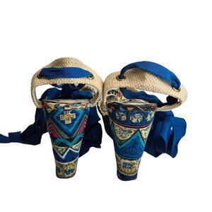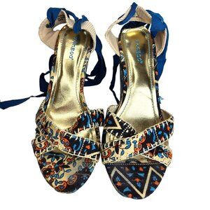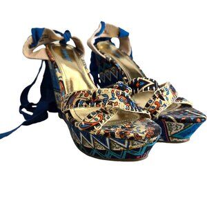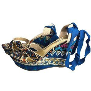 Bamboo Criss Cross Platform Wedge Sandals Ankle Wrap Blue Floral Boho Sz 8