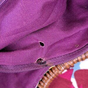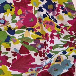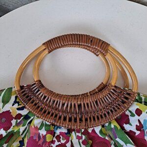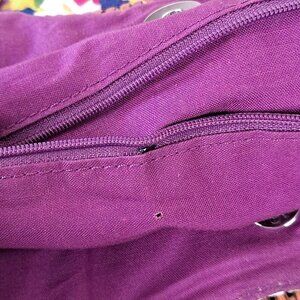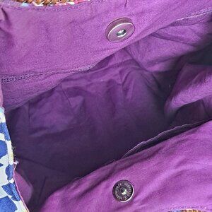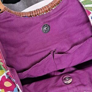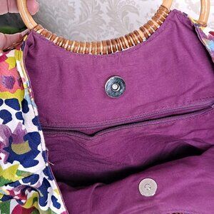 This colorful, round bag has two oval shaped bamboo handles that are wrapped in rattan. The fabric has a white background with a fuchsia, purple, yellow, green, blue and pink floral pattern. The interior has purple fabric lining with 2 slip pockets and 1 zip pocket. Magnetic snap closure. There are a couple of small holes in the interior lining – please see pics.