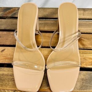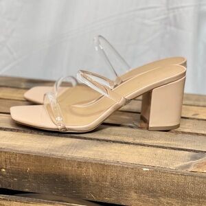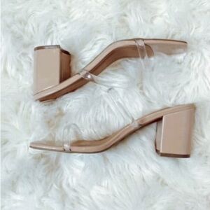 Heels features a nude bottom, padded base, double clear straps, and runs true to size!