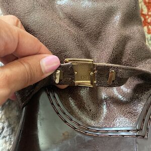Details: Bamboo heeled brown boots faux fur lined. Buckle, sparkles, all man made material. Perfect for winter, fall, snow and to wear with thick leggings, round toe, shiny, gold buckle accent. Faux fur on the inside, but not in the feet area. 1" heel.