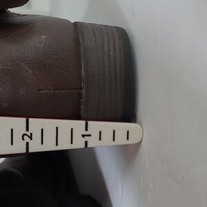 Brown vegan leather is gently crinkled as it climbs up a brass-studded shaft. Red lining around brass zipper for added interest.